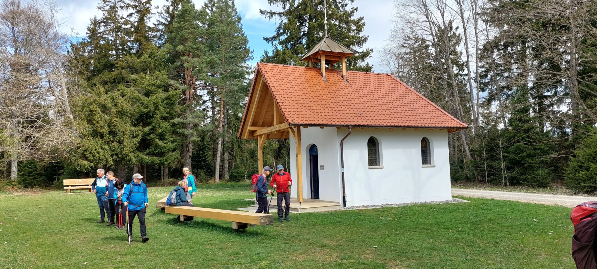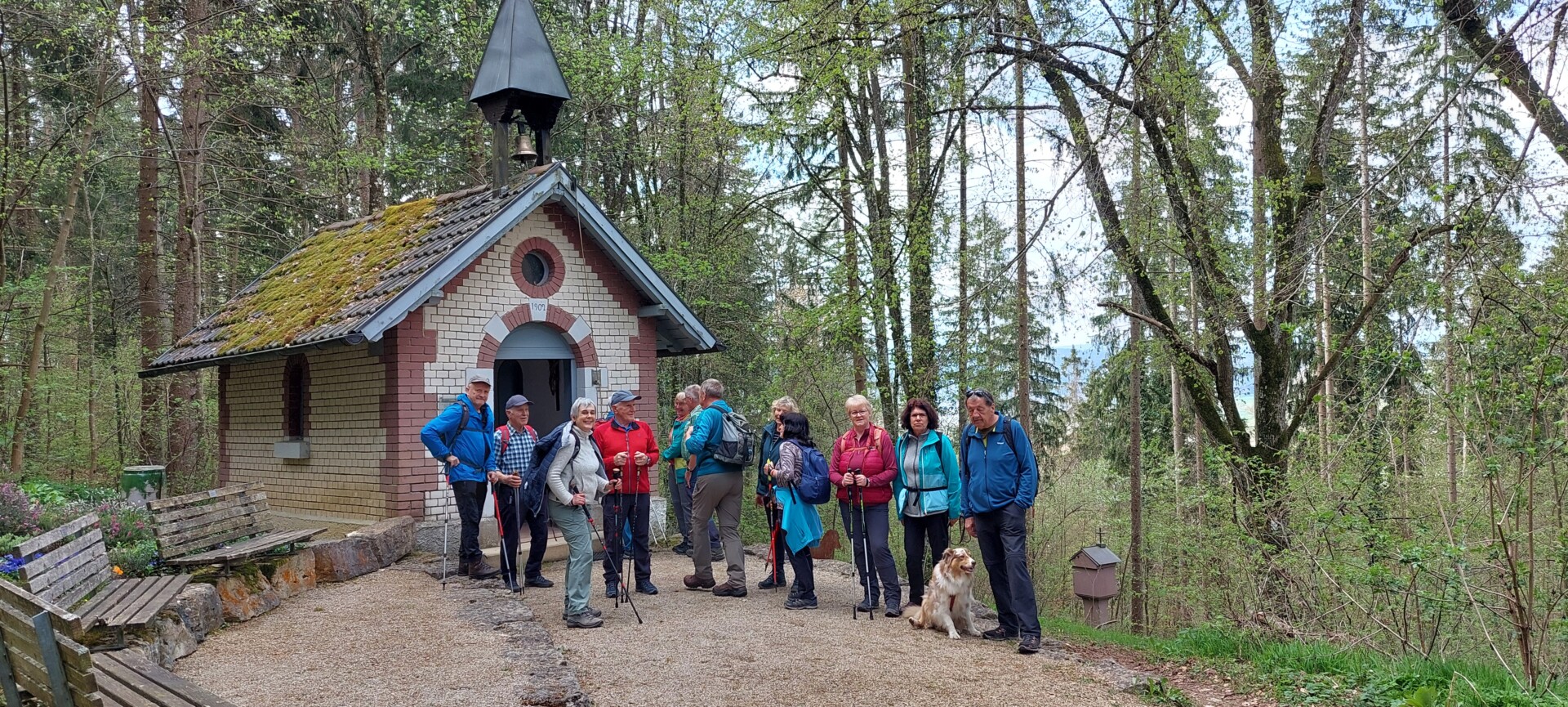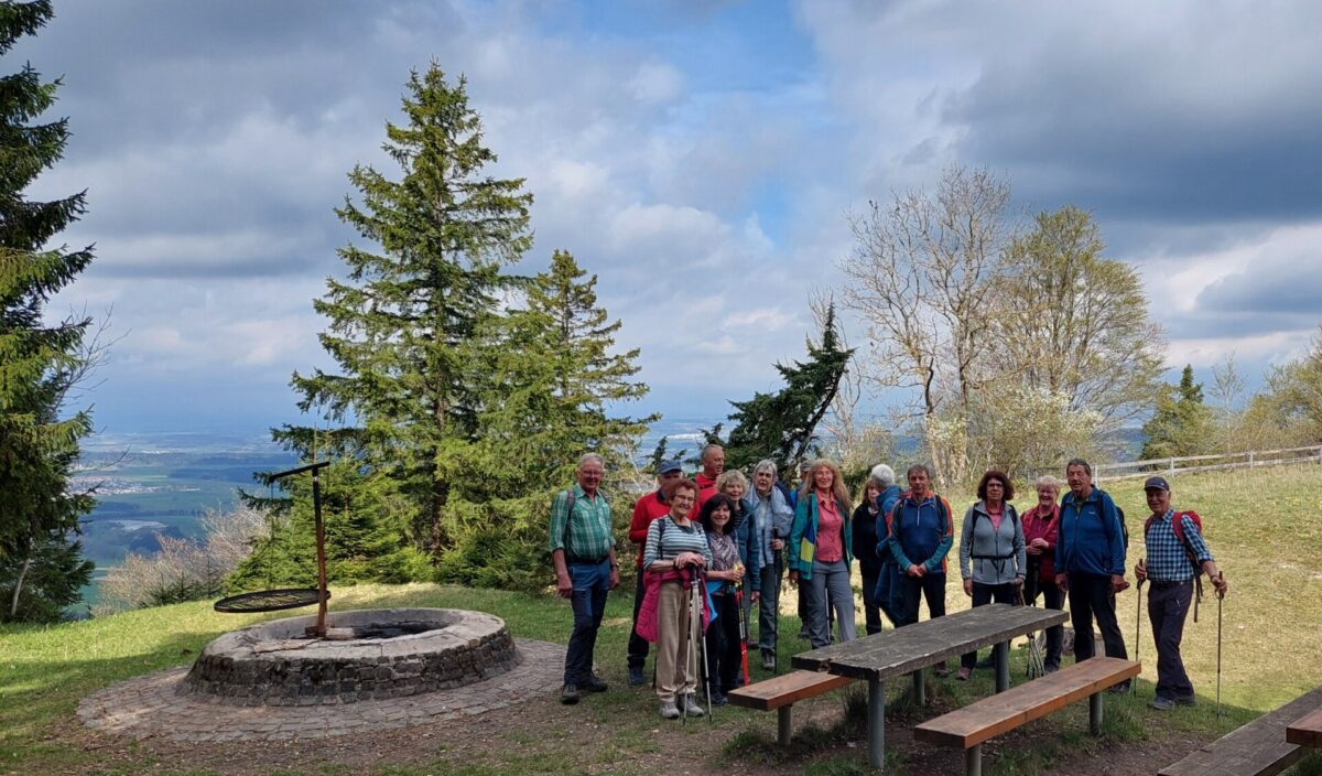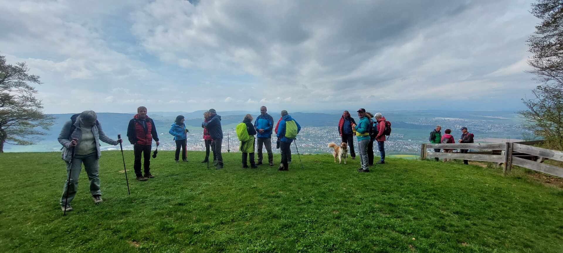 Der Schwarzwaldverein Lauterbach hatte am Sonntag, den 19. 4. 2026 zur Wanderung auf dem Klippenecksteig eingeladen. Trotz unsicherer Wetterlage hatten sich den den Abfahrtspunkten in Lauterbach, Schramberg und auf dem Sulgen 17 Wanderfreude eingefunden, um über Rottweil nach Denkingen zu fahren. Bei Schützenhaus startete die Tour gleich mit einem steilen Aufstieg, vorbei an der Nothelferkapelle zum Klippeneck. Dort oben an der Traufkante wurden die Wanderer von stürmischen Böen begrüßt. Am Trauf entlang führte der Weg relativ eben zur Josefskapelle, wo die Teilnehmer in den Strahlen der wärmenden Sonne das Panorama über Spaichingen genießen konnten. Auf dem weiteren Weg Richtung Dreifaltigkeitsberg machte der April seinem Namen Ehre und veranlasste die Wanderer, ihren Regenschutz auszupacken. Bei der Rast am Dreifaltigkeitsberg hatte die Himmel jedoch seine Schleusen jedoch schon wieder geschlossen. Gestärkt machte sich die Gruppe an den Abstieg auf dem Kreuzweg. Vorbei am Gasthaus zur bleiche gelangten die Wanderer auf dem Studentenweg zurück zur Wassertretanlage ober halb Denkingen und erreichten nach etwa 3,5 Stunden und 9,5 Wanderkilometern mit 350 Höhenmetern Aud-i und Abstiegen das Schützenhaus. Nachdem sich alle mit Speis und Trank gestärkt hatten, danke Kurt Gießer dem Wanderführer Hans Huber für die abwechslungsreiche Wanderung, ehe sich die Teilnehmer wieder auf die Heimreise machten.