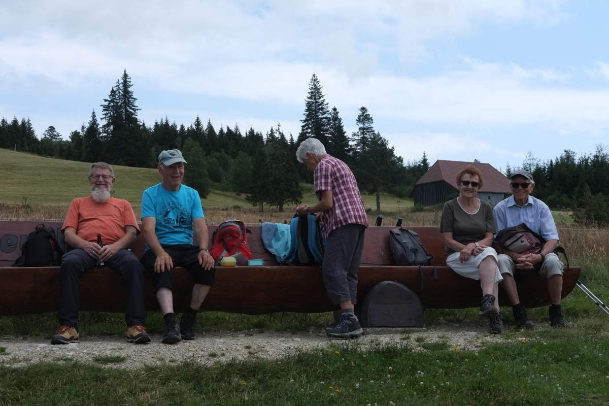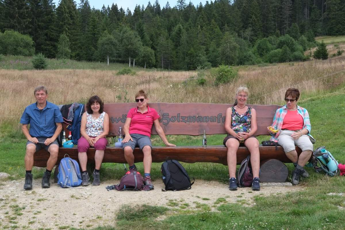 Start und Ziel der genussvollen Wanderung am 16. Juli   war Hinterzarten. Am Anfang der Tour folgten wir dem Westweg, bevor wir dann abbogen zum idyllischen Mathisleweiher. Immer im Wald auf wunderschönen Pfaden gelangten wir dann wieder zum Westweg. Beim Häuslebauer sorgte dann ein Rastplatz mit schönem Blick auf den Feldberg. Ein Getränkebrunnen bot uns Erfrischendes zum Vesper. „Der schönste Rastplatz auf einer Wanderung, die ich je erlebt habe“ bekundete ein Teilnehmer. Nach ausgiebiger Rast erklommen wir dann den Windeckkopf, mit 1209m der höchste Punkt Hinterzartens, gleichzeitig auch unserer Tour. Von der Bergstation der Thomalifte bot sich nochmals ein schöner Ausblick über Hinterzarten über Breitnau hinüber zur Weißtannenhöhe bis zum Hochfirst. Ein steiler Abstieg brachte uns vorbei am Wohnhaus des Säbelthoma, Namensgeber unserer Rundwanderung. Thomas Steiert war ab 1829 Dorfpolizist in Hinterzarten und war immer mit seiner Dienstwaffe, dem Säbel unterwegs, sogar in der Kirche. Nach dem Gottesdienst konnte die Bevölkerung dann immer das Neueste von ihm erfahren. Nach der 4-stündigen Wanderung machten wir dann eine Abschlußeinkehr im Gasthaus Krone, Unterwirtshäusle.