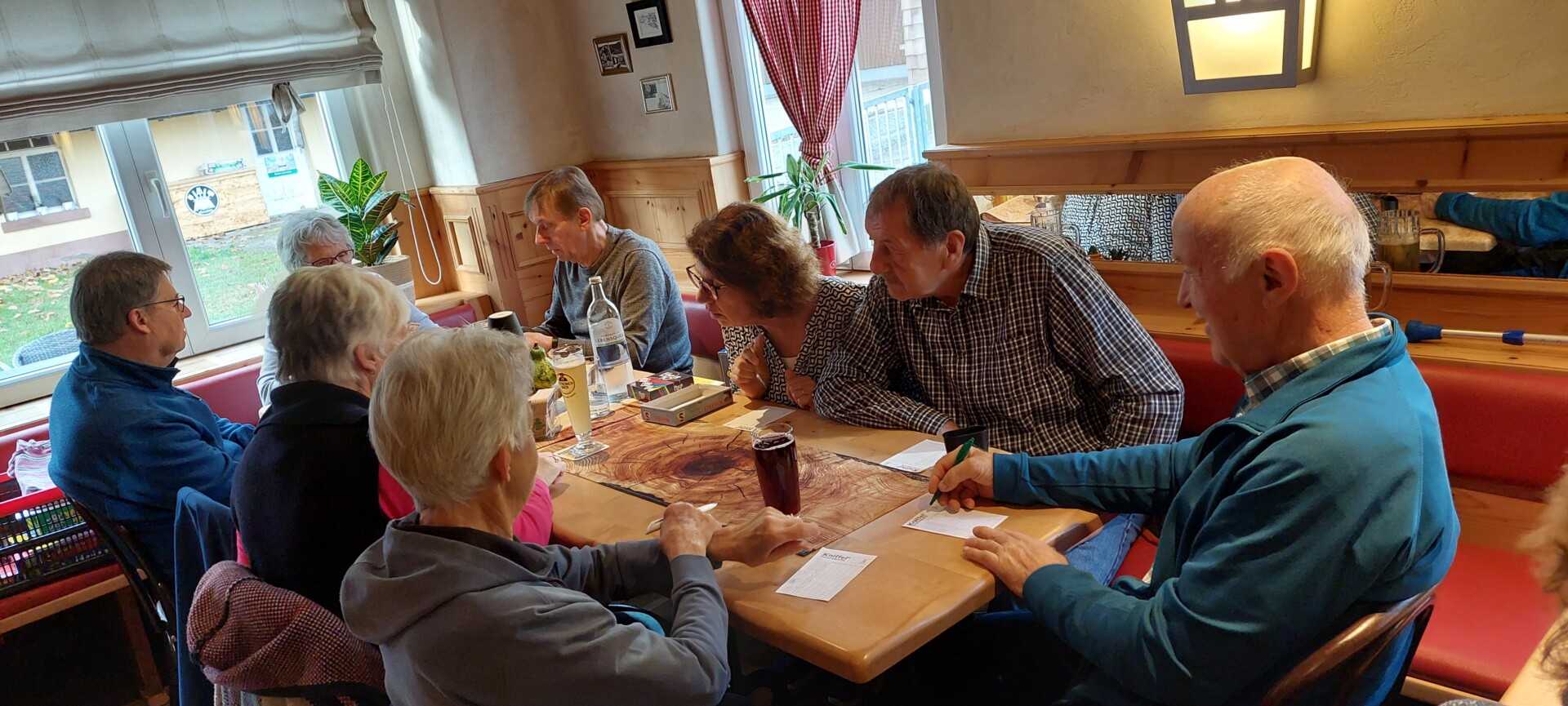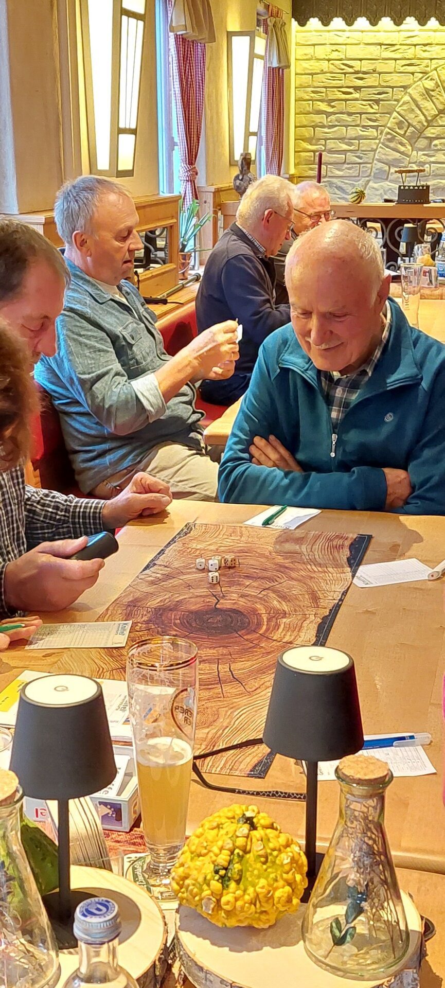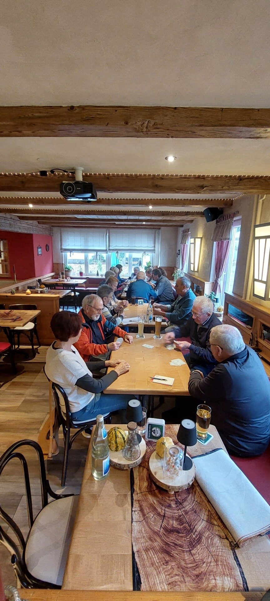 Hans-Jürgen Brugger hatte in die Brauerei zu einem Spielnachmittag eingeladen. Diesmal waren Brettspiele nicht gefragt. In drei Gruppen wurde Binokel und „Hunderte“ gespielt, während die vierte Gruppierung „die Finger von den Karten ließ“ und sich beim „Kniffel“ mit den Würfeln vergnügte. Nach über 2 Stunden anstrengender Spielaktivität freuten sich die „nicht-Wanderer“ noch auf ein gutes Essen in fröhlicher Runde.
